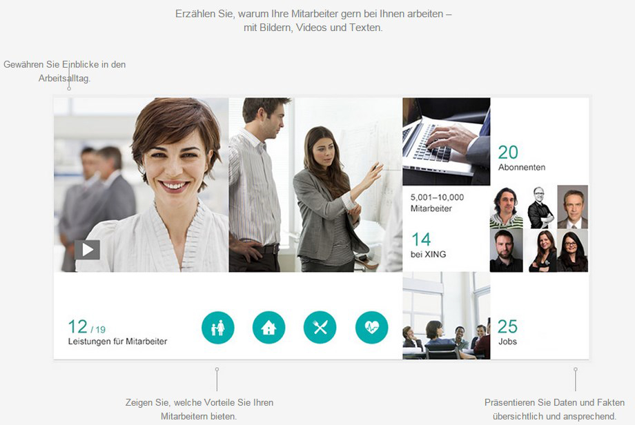 Für Unternehmen gibt es die Möglichkeit, sich einfache Firmenseiten anzulegen, in denen man nur den Namen, das Logo und eine kurze Unternehmensbeschreibung plus Verlinkung zur eigenen Website eintragen kann. Alternativ ist die Präsentation mit einem kostenpflichtigen Employer Branding-Profil möglich, welches Xing gemeinsam mit Kununu entwickelt hat und Unternehmen seit März 2014 zur Verfügung stellt. Das Business-Netzwerk kaufte die Arbeitgeber-Bewertungsplattform 2013 für 3,6 Millionen Euro. (6) Die Employer Branding-Profile sollen Unternehmen dabei helfen, „die besten Kandidaten für ihr Unternehmen zu gewinnen und gute Mitarbeiter langfristig zu binden.“