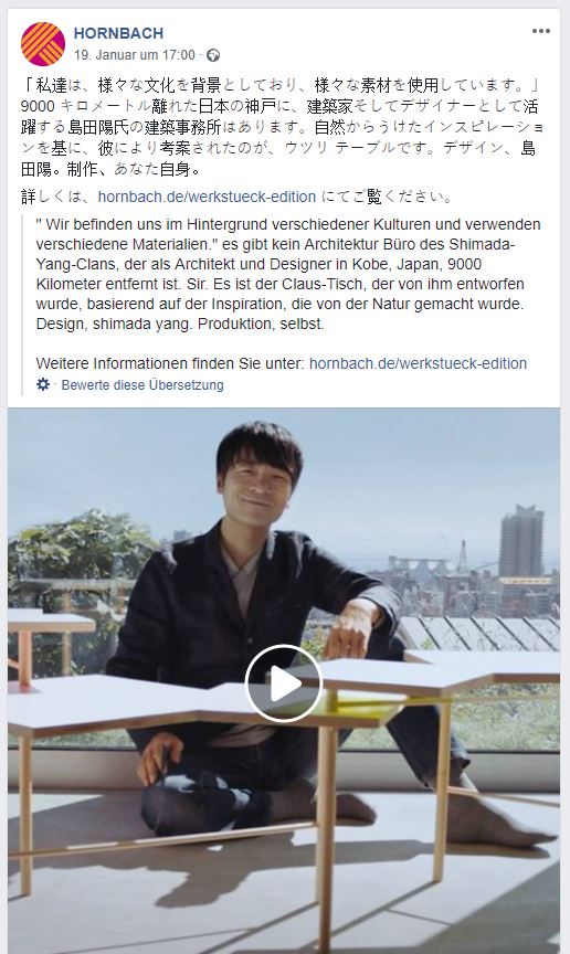 Hornbach greift in dieser Werbung auf ein Facebook-Meme zurück, welches Ende 2018 eine gewisse Popularität erlangte. Dabei verfasst man mit einem Übersetzungsprogramm Texte in asiatische Schriftzeichen (japanisch oder chinesisch) und die Nutzer können diese mit Hilfe der Übersetzungsfunktion von Facebook übersetzen lassen.