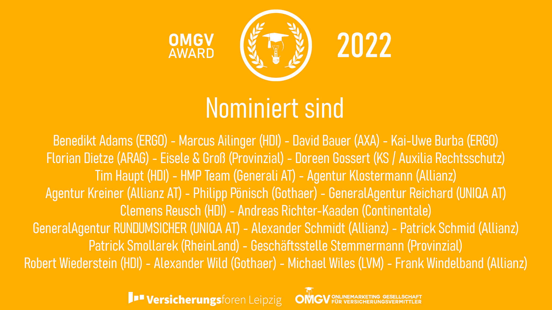 Die Nominierungsphase ist vorüber und für die vier Kategorien wurden insgesamt 24 Vermittler / Agenturen nominiert. Erstmalig entscheidet in diesem Jahr nicht nur eine Fachjury über die Preisträger, sondern auch die Versicherungsbranche. Bis Ende Mai kann ab sofort abgestimmt werden. Die Verleihung der OMGV Agentur Awards 2022 findet am 21. Juni im Rahmen des „Messekongress Kundenmanagement in Versicherungen“ statt.