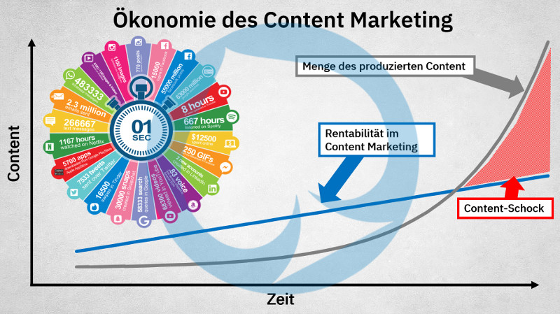Der Begriff „Content Schock“ wurde 2014 von Mark Schaefer geprägt. Er beschreibt, dass wir erstmalig in einer Zeit leben, in der mehr Content produziert wird, als konsumiert werden kann. Was bedeutet die Menge der Inhalte, welche um die Aufmerksamkeit der Konsumenten konkurrieren, steigt rapide an und in gleichem Maße sinkt die durchschnittliche Aufmerksamkeit pro Inhalt.