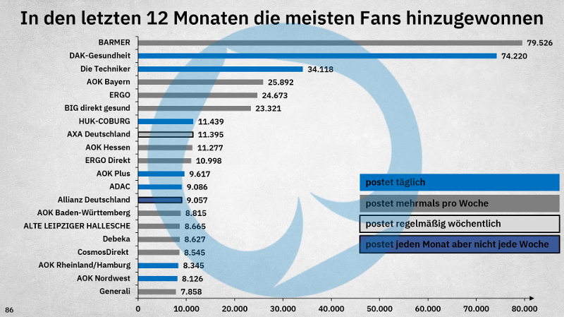 Die hochwertigen Inhalte hingegen zahlen zweifellos in das vertrauensbildende Image des jeweiligen Versicherers ein. Bei einer hohen Postingfrequenz steht allerdings der ökonomische Aufwand in der Produktion in keiner Relation zu den Ergebnissen.