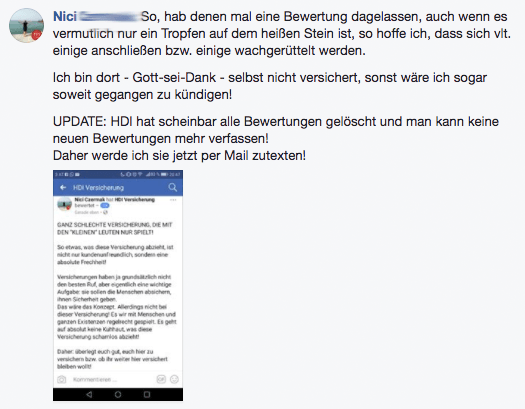 Allerdings ist dies bei der Kommunikation der HDI nicht zu erkennen. Weder hat man im Zuge der Bild-Anfrage direkt die Bewertungsfunktion der eigenen Facebook-Seite deaktiviert, dies geschah erst nach einer Vielzahl von Negativbewertungen. Noch hat man genügend Personal abgestellt und eine transparente Kommunikationsstrategie entwickelt, welche die Vorwürfe abfedert und dem Shitstorm den Wind aus den Segeln nimmt.