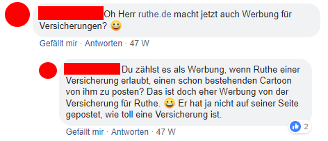 Fanseiten auf Facebook bzw. Social Media Kanäle allgemein bieten unabhängig vom Inhalt eine Reichweite. Sie bieten eine Plattform, von der letztendlich stets der Inhalt im ersten Moment profitiert. Etwas überspitzt, aber deswegen nicht falsch, stellt ein Facebook-Nutzer unter dem Posting deshalb auch richtig fest, dass vom Prinzip her die CosmosDirekt mit diesem Posting Werbung für den Cartoon macht. Denn sie stellt ihm ihre Reichweite zur Verfügung.
