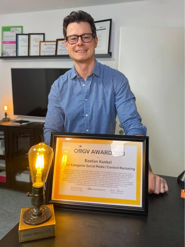 Mit dem OMGV AWRD in der Kategorie „Social Media & Content Marketing“ wurde Bastian Kunkel bereits zum dritten Mal ausgezeichnet. Erhielt er den ersten AWARD für seinen YouTube-Kanal und den zweiten für den Podcast „Versicherungsgeflüster“, wurde er dieses Jahr für seinen Instagram-Aktivitäten ausgezeichnet. Denn die Jury war sich einig, mit seinem herausragendem Content Marketing sorgt er sowohl für ein besseres Verständnis für Versicherungsthemen als auch für eine bessere Außendarstellung der Versicherungswirtschaft allgemein. Bastian Kunkel ist Inspiration für viele in der Versicherungsbranche und gleichzeitig ihr Botschafter. All dies macht ihn zu einem würdigen Preisträger.