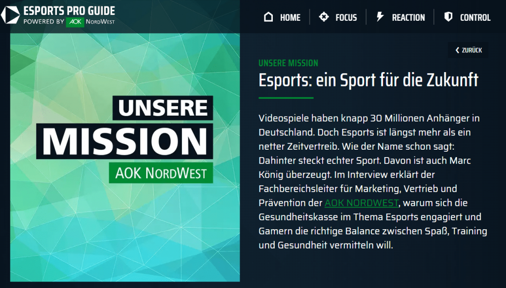 Neben der Partnerschaft mit Schalke 04 eSport launchte die AOK NordWest im vergangenen Jahr außerdem ihren Esports Pro Guide. Dabei handelt es ich um ein Portal, dessen inhaltliches Angebot aus informativen Artikeln und Videos rund um das Thema Gaming besteht und in dem man Tipps und Tricks von eSport-Profis erhält.