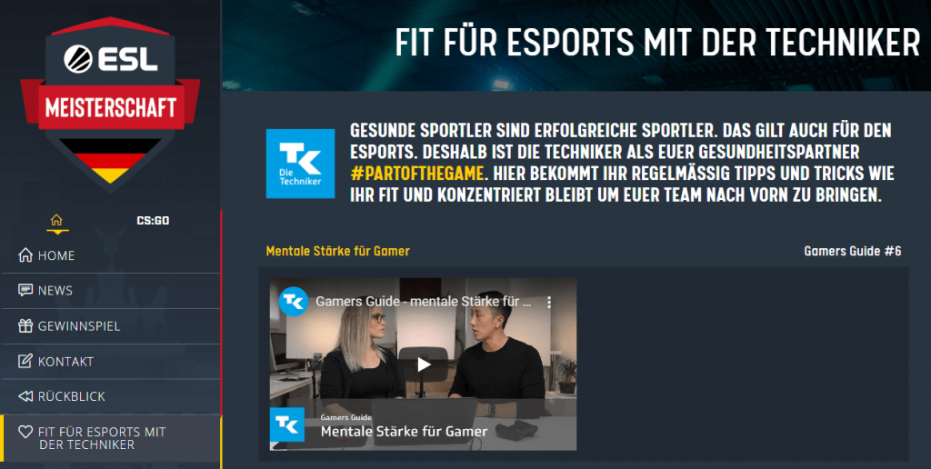 Dabei ist die Techniker nicht nur mit ihrem Logo präsent, sondern produziert auch Inhalte für die Zielgruppe, wie bspw. den Gamers-Guide. Im Mittelpunkt der Kooperation steht die Förderung der mentalen und körperlichen Verfassung der Spieler und Fans. Dabei sollen die geplanten Gesundheits-Aktionen informieren und Risiken vorbeugen. Gerade für die Teams soll hier ein weiterer Mehrwert geschaffen werden, um mit noch besseren Voraussetzungen in den Wettkampf zu starten. Neben dem Engagement als Gesundheitspartner für die ESL in Deutschland ist die Techniker Krankenkasse zusätzlich Founding-Partner der TK University Open. Dieses Turnier richtet sich an eSports-begeisterte Studenten und wird auf ESL Play ausgerichtet. Die Finalspiele fanden auf der gamescom 2019 in der ESL Arena statt.