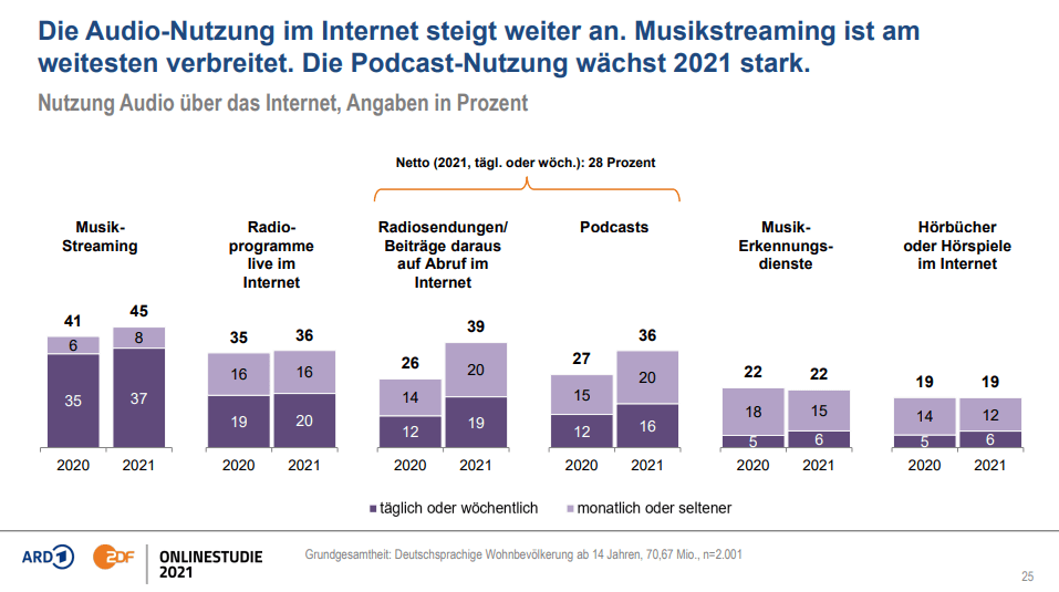 Auch wenn Clubhouse nur ein extremer Hype Anfang des Jahres war und Ende des Jahres niemand mehr darüber spricht, ist es Audio allgemein nicht. Ganz im Gegenteil. Hier sehen wir seit Jahren einen klaren Trend zu mehr Audio-Nutzung. Und wie man sieht ist damit nicht nur Musikstreaming gemeint, sondern es werden ebenso mehr Online-Radio, Hörbücher und vor allem Podcasts gehört.