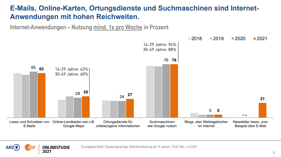 Was man trotz allen Entwicklungen in Sachen Social-Media und Audio nicht vergessen darf, ist die Nutzung der Online-Klassiker. Suchmaschinen nutzen 94% der unter 30-Jährigen, 63% lesen und schreiben E-Mails mind. 1x pro Woche und 21% lesen Newsletter. Und diese Prozentzahl einmal in Relation zu setzen. Nur Facebook (28%) und Instagram (26%) wird von den Deutschen häufiger genutzt, als der Newsletter.