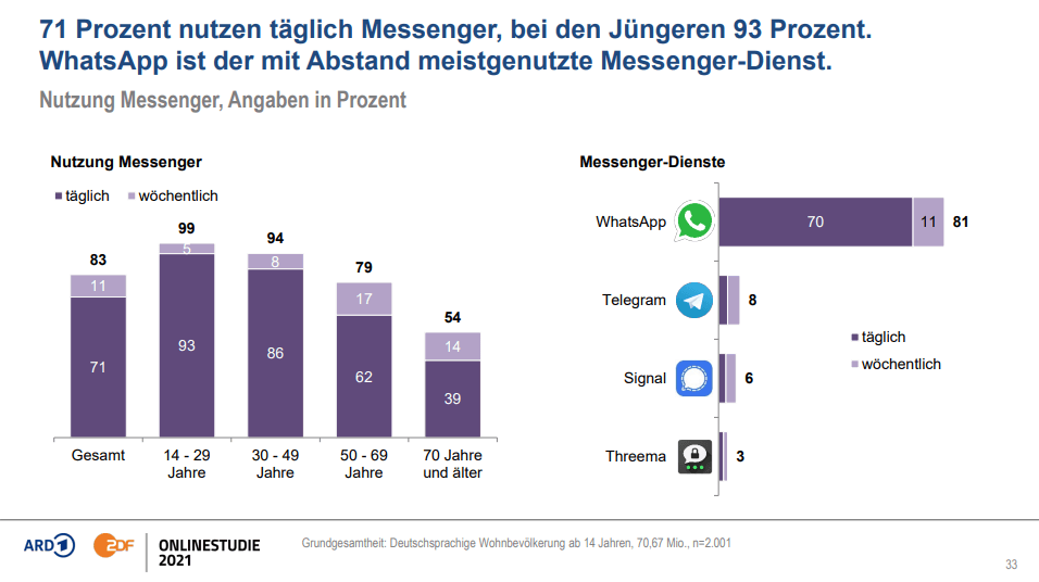 Weniger überraschend, aber nicht weniger wichtig ist die Messenger-Nutzung in Deutschland. Ganz im Gegenteil. Denn wenn man sich hier die „jungen“ Nutzer anschaut (damit meine ich alle U50(!)) sind Messenger aus der Kommunikation nicht wegzudenken. Ganz im Gegenteil.