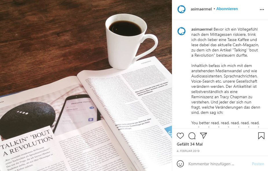 Für das aktuelle Cash-Magazin durfte ich einen Artikel beisteuern, welche sich inhaltlich mit dem anstehenden Medienwandel befasst. Darin zeige ich auf, wie Audioassistenten, Sprachnachrichten, Voice-Search etc. unsere Gesellschaft verändern werden. Kurz, es geht um die Audiocalypse. Wer sich fragt, welche Veränderungen damit einhergehen, kann den Artikel auch online nachlesen.