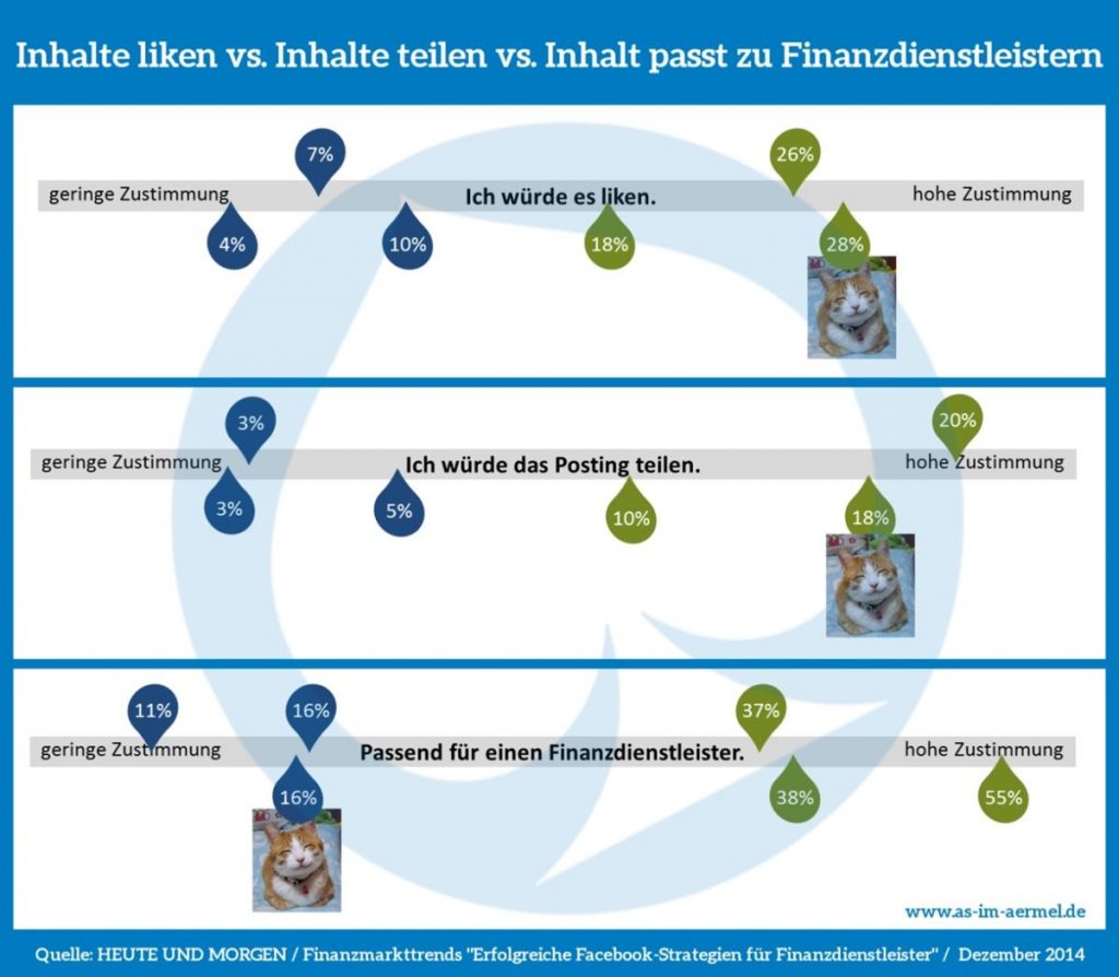 Insgesamt haben wir die klassischen fünf Inhaltskategorien getestet. Neben Entertainment, welche Postings beinhaltet, die einzig und allein der Unterhaltung dienen, gab es noch die selbsterklärenden Kategorien Produktinformationen, Ratgeberthemen, Unternehmensbeiträge und Gewinnspielen. Und nur bei den Inhalten der Entertainmentkategorie zeigte sich das wiederkehrende Muster, dass man diese Inhalte zwar liken und teilen würde, aber sie gleichzeitig, als nicht passend für die Finanzbranche erachtet.