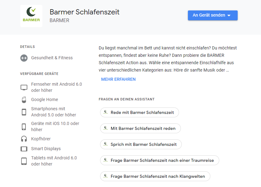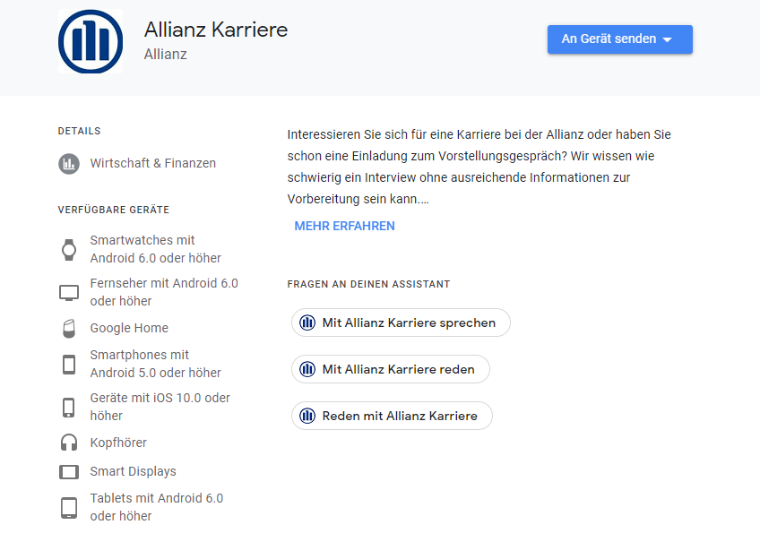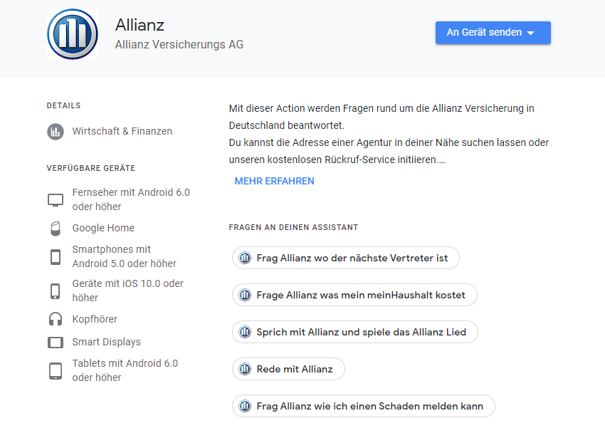 Derzeit gibt es vier Actions der deutschsprachigen Assekuranz. Diese werden im folgenden vorgestellt inkl. Beschreibung, den Gerätegruppen auf denen sie verfügbar sind. Mit Klick auf den Screenshot gelangen Sie stets direkt auf die entsprechende Actions-Übersichtsseite. Selbstverständlich können Sie die Actions auch direkt mit dem entsprechenden Sprachbefehl aktivieren.
