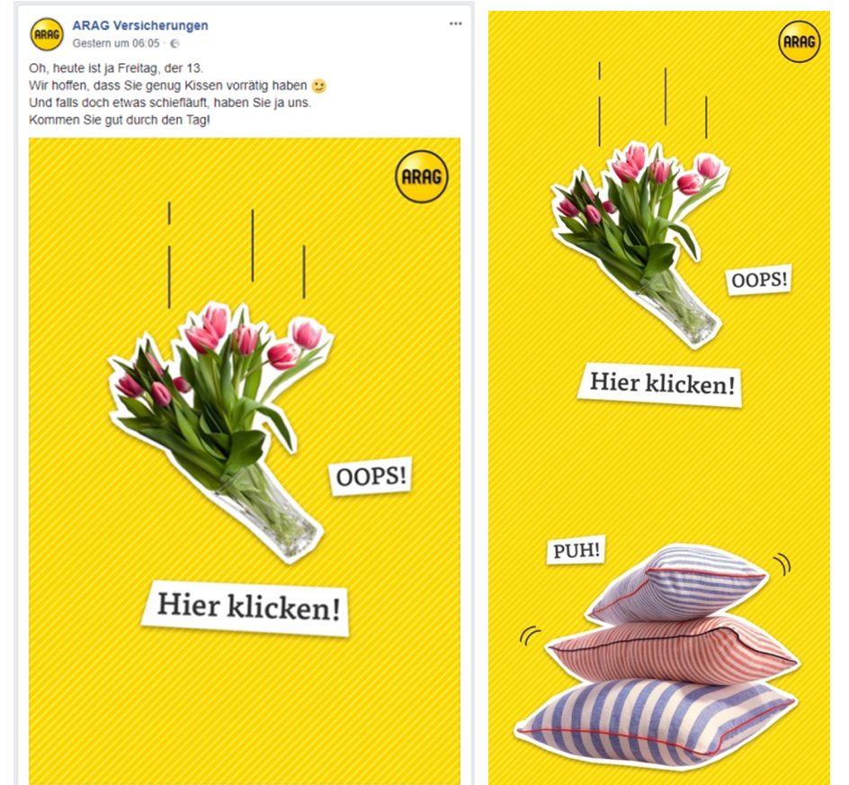 In dem folgenden Beispiel spielt die ARAG Versicherung mit der Darstellung von Grafiken in ihrer Facebook-Kommunikation. Sie veröffentlichen Bilder, die im Facebook-Feed nur ca. 2/3 ihrer Geschichte erzählen und mit der Aufforderung „Hier klicken“ explizit zur Interaktion auffordern. Erst nach dem Anklicken wird der komplette Inhalt freigeben. Der Vorteil dieses spielerischen Elementes ist damit zustande kommende Interaktion, welche a) positiv in den Facebook-Algorithmus einzahlt und b) vor allen Dingen die vollständige Aufmerksamkeit der Nutzer erreicht.