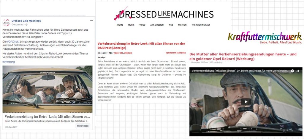 Ein gutes Beispiel hierfür lieferte die DA Direkt im Kfz-Herbst. Für die Fortführung der Retrowerbekampagne „Verkehrserziehung“ produzierte man nicht nur weitere Spots im Look der 70er Jahre, sondern kooperierte bei der Content-Distribution auch mit reichweitenstarken Blogs wie bspw. Dressed Like Machines oder Kraftfuttermischwerk.